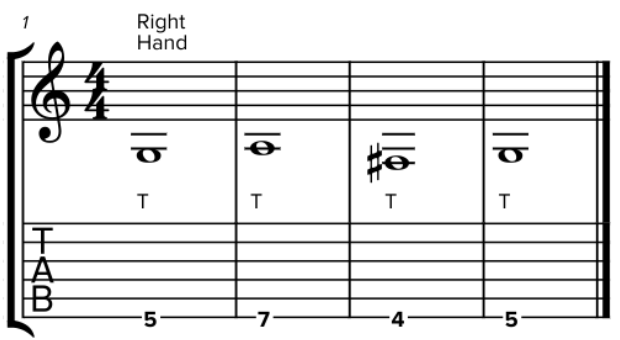 We start off with the left hand, as that’s likely to be the most familiar part, since it’s no different to playing traditionally. We’re making sure to only use hammer ons and pull offs to play the notes. We can’t pick the strings as the right hand is going to be occupied later! If you’re new to the idea of hammer-ons and pull-offs we’ll give a brief explanation here, but for an in-depth lesson check out our legato lessons. Here’s the tab for the left hand part:
