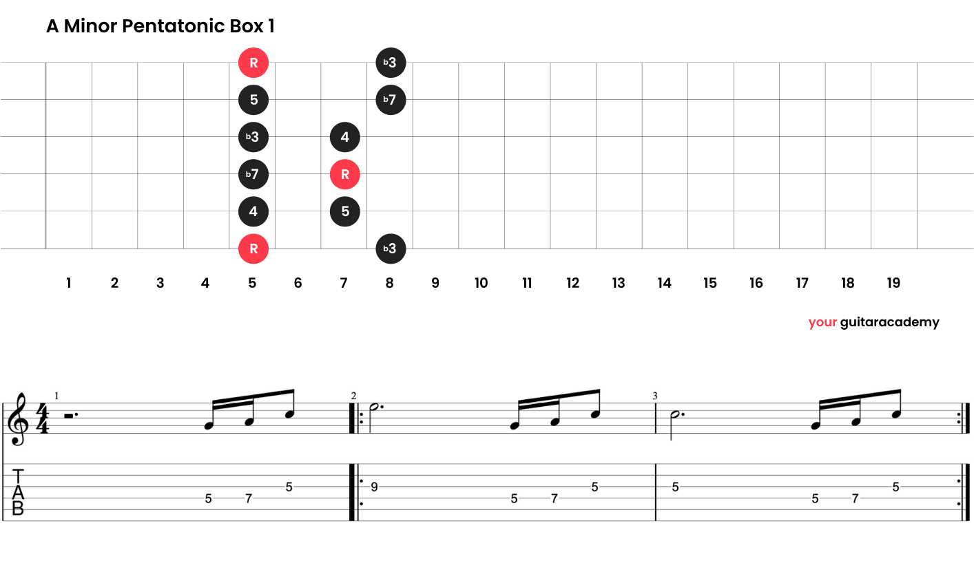 First up, let's take the simple melody, which we're playing in Box 1 of the A minor pentatonic scale. The tab for this melody and the scale shape is as follows: