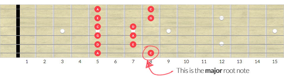 If you take your minor pentatonic shape 1, as shown below, and start from the second note... This is the major root note of the scale. This same concept can be applied to every single scale shape from the pentatonic. If you know where your minor root note is, you can move to the next note along, and it will be your major root note. Simples!