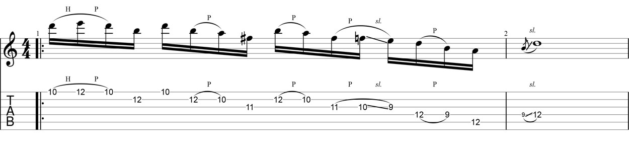 The lead section is based around Pentatonic Box 2, and uses an additional blues note to spice it up a little. The lick is essentially based around a simple sequence running through that scale shape. Below you can find the scale shape written out, as well as the tab.