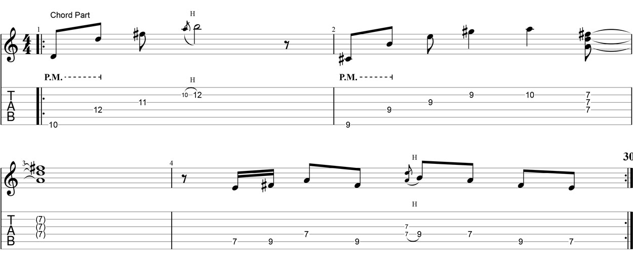 The chord section uses a 4 chord loop. We go from D major, C#m7, Bm7 and D major again. The actual key of the song is D major, but we use a C#m7 rather than a C#m7b5, which would be the natural chord of the key. This is a relatively common switch that adds a bit of a twist, or interest, to a basic chord pattern. The D major pentatonic will still work beautifully well. Below are the chords and the tab.