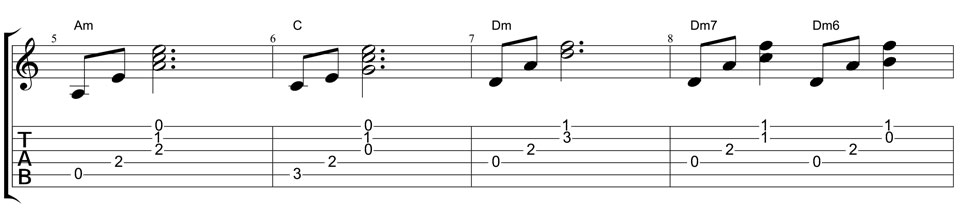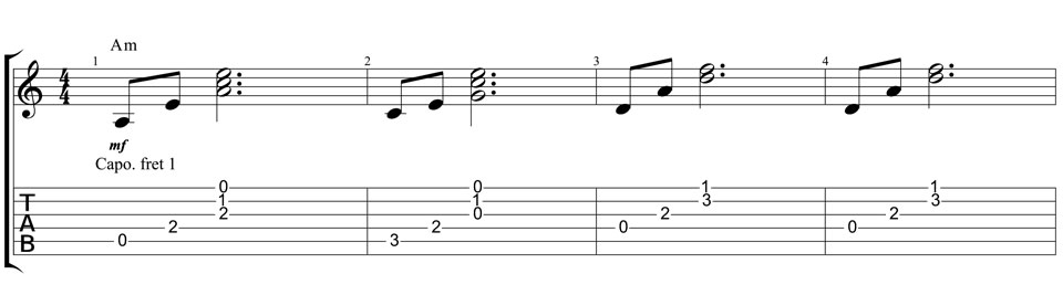 In this version we start by adding a capo to fret 1. This allows us to use the basic chords Am, C and Dm for most of the song. We also simplify the strumming pattern by adding a basic picking idea that works well with the song! Check out the chords and tab below.