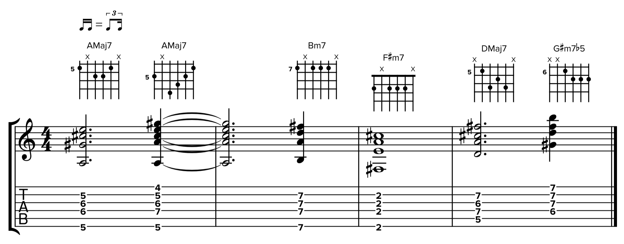 Maj7, Min7, Min7, Maj7, Dom7, Min7, Min7b5