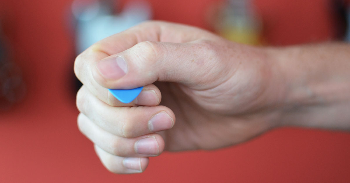 The video above takes you through exactly how to hold the pick and hold your fingers, and the images below should help to get it just right. At this point, it is your choice as to whether you use the fingers or a pick, but for the purpose of our future lessons, we will be using just the fingers. Remember, both ways will feel strange at first; it will probably take a week or two to become comfortable, so stick with it! If you are using a pick, In terms of any medium to heavy pick will do.