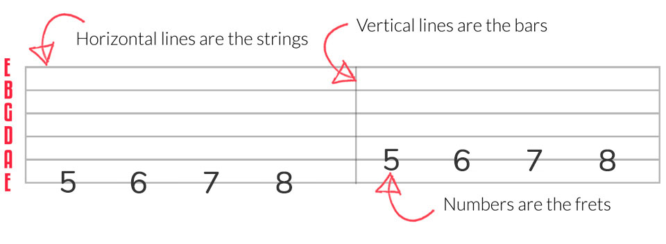 We also look at how to read guitar tab in the video, so if you need a little reminder, please take a look at this diagram: