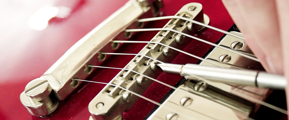- 4. Adjust the saddle on the bridge using the flathead screwdriver. Tighten the screw if the string is sharp, and loosen it if the string is flat